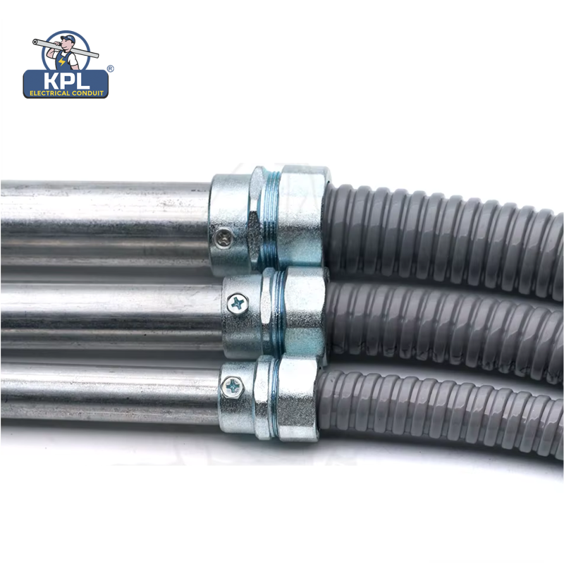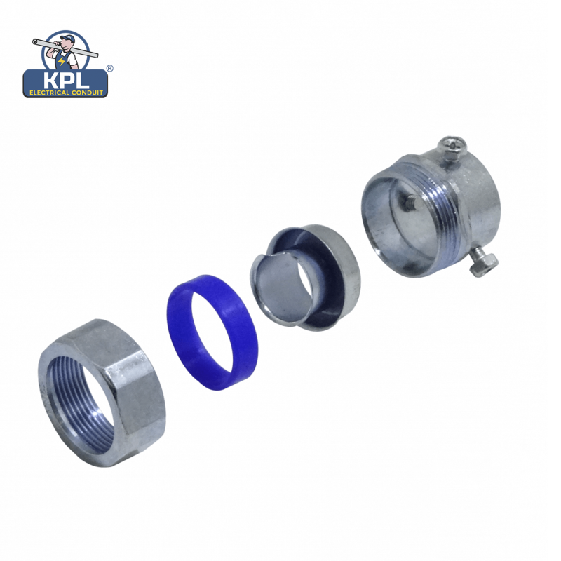 El cuerpo está hecho de aleación de zinc con conformidad con RoHS. El accesorio se ajusta a EMT sin rosca mediante un tornillo de fijación y se conecta con un conducto flexible de metal mediante una tuerca.